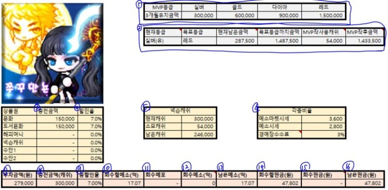 ① : 넥슨에서 정한 MVP별 3개월간 유지금액을 적은 란입니다.② : 자신의 목표 달성을 위한 넥슨캐시를 계산하는 부분입니다.1. 현재 등급: 총 9개의 선택지(브론즈, 실버(유), 실버, 골드(유), 골드, 다이아(유), 레드(유)가 있으며, ‘등급(유)’으로 되어 있는 것은 등급이 내려가지 않았지만 다음달 떨어질 예정이신 분이 선택하는 것입니다.2. 목표 등급: 자신이 목표로 하는 등급을 선택하십시오.3. 현재 남아있는 금액 : 메이플캐시샵에 표시되는 “다음 등급까지 남은 금액”을 적어주세요.4. 목표 등급까지의 금액: 여기에 표시되는 금액만큼 MVP작을 하셔야 합니다.5. MVP 작성 캐시 : 품목표에서 자신이 구매 개수를 적은 만큼 자동으로 계산되어 표시되는 부분입니다.6. MVP 작후 금액 : 현재 남은 MVP 작을 해야 하는 금액입니다.③ : 충전금액을 기입하는 매스로 넥슨 캐시 충전금액입니다. 예를 들어, 이벤트에서 150,000에서 155,000 넥슨 캐시가 충전되면 155,000원을 적어 주십시오.④ : 할인율, (충전에 사용한 현금) / (충전된 넥슨캐시) *100을 한 값을 적어주세요.상품권류의 경우 구매 시 할인율을 적어주세요. (토스나 각종 행사시 위 공식에 맞게 할인율을 요청하신 후 입력해주세요.) ◆ : 내 넥슨 캐시와 소모량, 남은 캐시가 자동으로 계산되는 칸입니다.⑥ : 각종 비율을 입력하는 란입니다. 메소마켓 시세는 메소마켓에서 확인 후 기입하고 메소마켓은 자신이 현금화할 때 1억 메소당 비율을 기입하며 경매장 수수료는 ②에서 현재 등급란에 선택한 등급에 따라 자동으로 입력됩니다.⑦ : 투자금액이 계산되는 칸, 자신이 실제로 투자한 현금이 얼마인지를 계산하는 칸입니다.⑧ : 충전된 넥슨 캐시가 계산되는 칸입니다.⑨ : 종합 할인율이 계산되는 칸입니다.⑩ : 회수할 메소드가 계산되는 칸입니다. 품목표에서 입력한 정보에 따라 자동 계산됩니다.⑪ : 회수한 메포 쓰기란에서 페이백, MVP 유지 및 성취보상으로 받을 메포를 적어주세요. 이 값은 を을 계산할 때 사용돼요.⑫ 회수 메서드를 쓰는 칸에서 자신이 경매장을 통해 번 메서드를 쓰십시오.⑬ : — — の의공식으로계산되는칸입니다. 팔리지 않은 아이템이 팔렸을 때 들어오는 메소라고 보시면 됩니다.⑭ : ᅳᆯ 을ᅴ 비율에 따라 예상되는 현금화 가격입니다.⑮ : 실제로 현금화한 금액을 써주세요.⑯ 지금부터 현금화 해야 할 금액입니다. 만약 이 금액이 0원이라면 모두 회수한 것이고 0보다 작아지면 이득을 본 것입니다.0보다 크면 손해입니다.