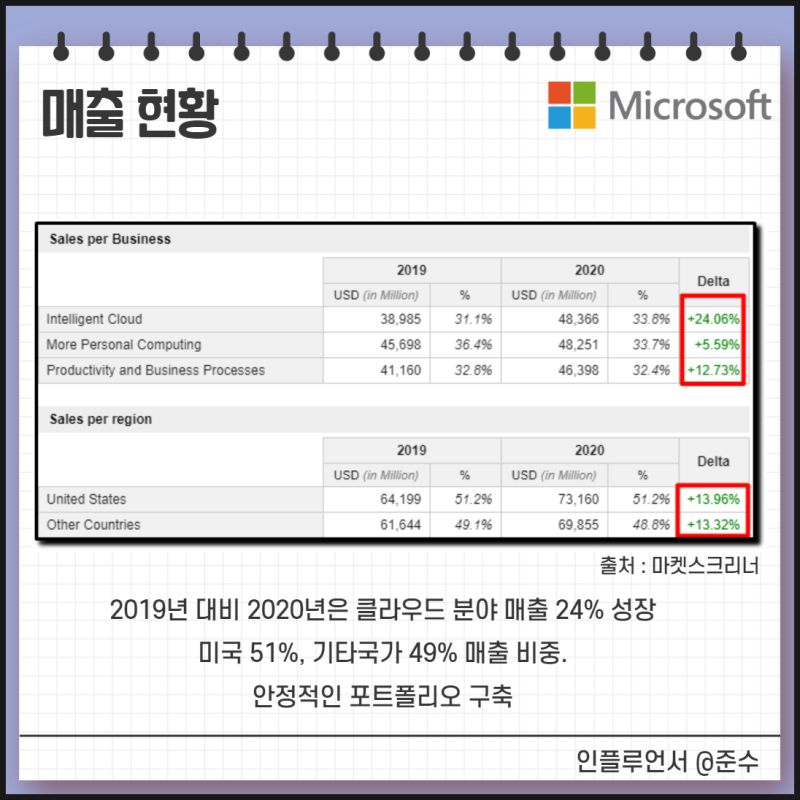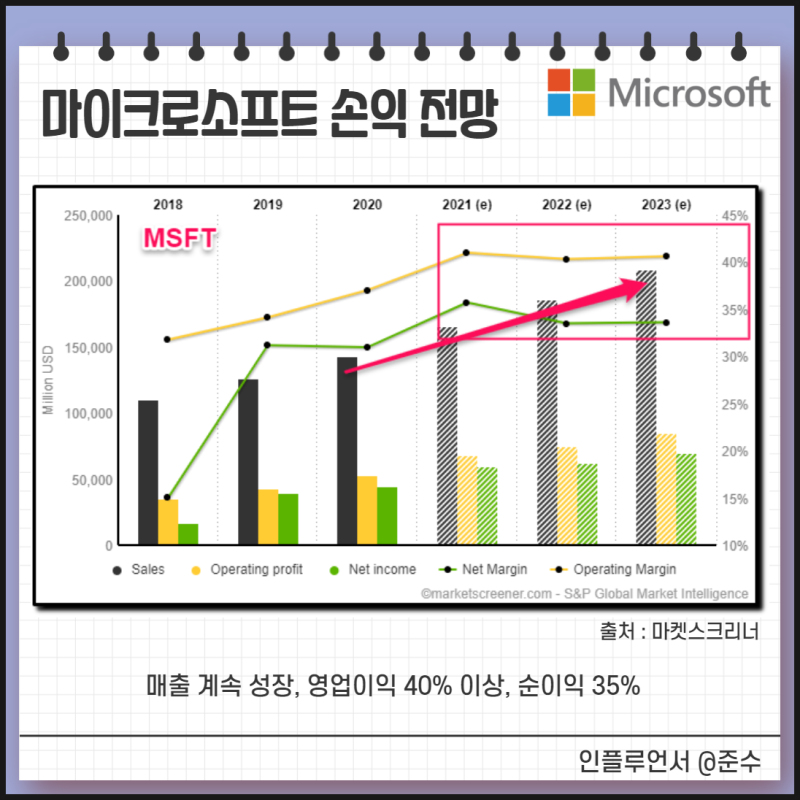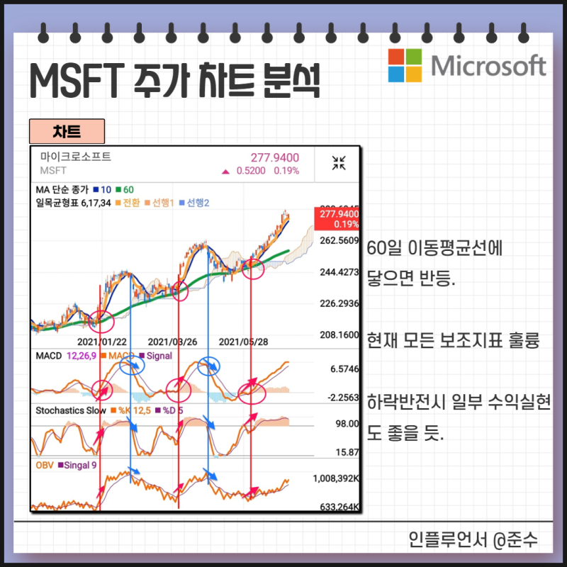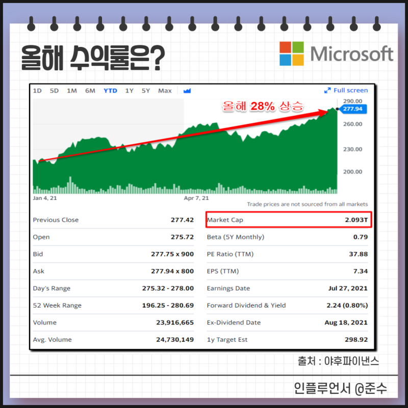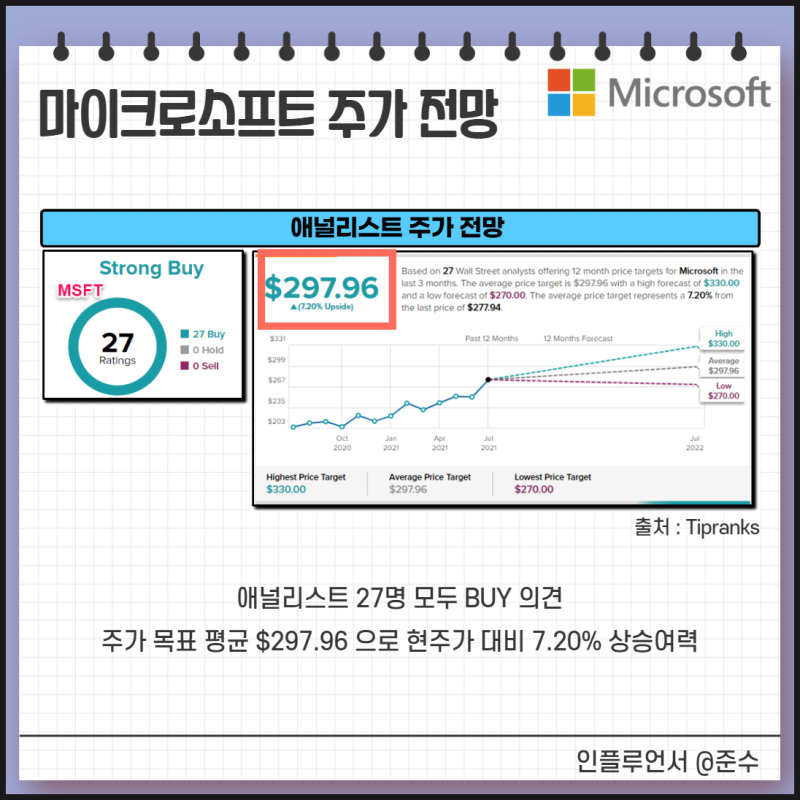 첫번째 메뉴인 StockAnalysis에는 기업 정보에 관한 정보가 기재되어 있습니다. 차트, PER, EPS, 재무 정보 등을 보실 수 있습니다. 이 부분은 쉽게 확인하시면 좋겠다고 생각하므로 생략합니다.2번째 메뉴를 보면 Analyst Forecasts이 있는데 Analyst 30명이 예측하는 MS주가 전망에 관한 정보가 있습니다. 마이크로 소프트의 주가에 대한 Analyst Rating Consensus를 보면 Analyst 30명 중 28명이 “Strong Buy”에서 강력한 매수 의견을 내고 있습니다.1년 후 마이크로 소프트의 주가 전망 평균치를 보면 평균 327.41달러로 현재의 242.45달러보다 35%상승한다고 예상하고 있습니다. Analyst가 전망한 평균 가격입니다. 이것도 절대적인 것은 아니므로, 참고가 되시죠. Insider Trading는 기업 내부자의 매도, 매수 현황을 나타내고 있습니다. 구매자보다 매도가 비정상적으로 많아지면 아무래도 좋지 않은 신호요.그 이외의 하단 메뉴를 보면 마이크로 소프트 주식에 대한 배당/재무 정보 등 다양한 정보가 있으니 접근하고 확인하고 보세요.