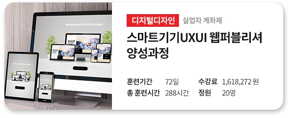 국비지원과정(실직자, 구직자)을 통해 최대 50%에서 100%까지 수강료를 지원받을 수 있습니다.UI/UX 웹 퍼블리셔 양성과정이란?요즘대중교통을이용해서점점스마트기기를통해서온라인쇼핑을하거나필요한정보를검색하는사람들이많아지고있죠?이제는 PC보다 모바일 유입이 많은 만큼 모바일에서 볼 수 있는 웹사이트 이미지와 웹사이트 링크도 중요해지고 있습니다.웹퍼블리셔는웹을디자인하는것뿐만아니라웹을구축하는것부터유지보수까지전반적으로업무를하는사람을말합니다.
