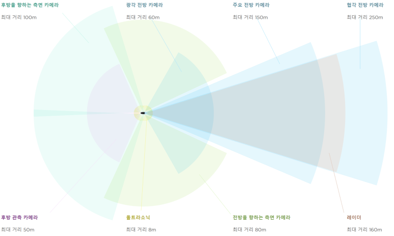 ● 레이더 : 1개의 전방 레이더 (최대거리 : 160m) ● 카메라 : 총 8개 (3개의 전방 카메라, 2개의 측면 카메라, 3개의 후방 카메라) ● 초음파 센서 : 전후방 총 14개
