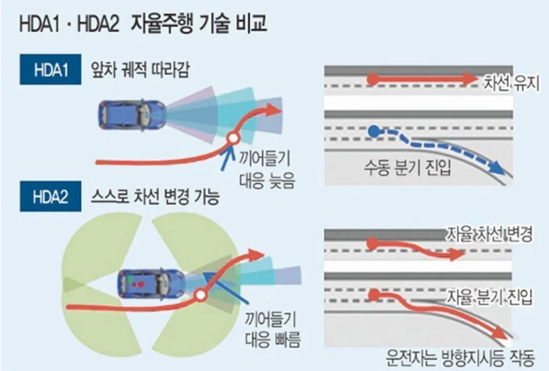 GV80의 HDA2를 예로 들면, HDA는 전방 카메라(1)+전망 레이더(1)+후방 방향 레이더(2)의 조합으로 HDA2는 전방 측면에 2개의 레이더를 추가하여 ACC 주행중 측면에서 끼어드는 차량에 대한 반응성을 보강했습니다.